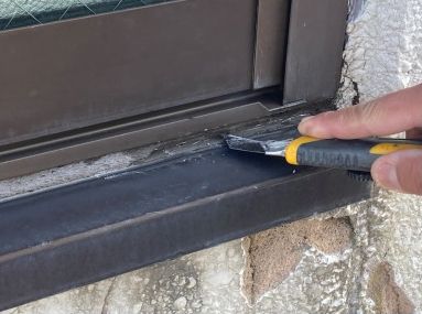次に劣化してしまい雨漏れの疑いが濃厚な窓下のコーキングを取り除いていきます。